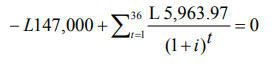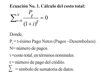 El cálculo del costo total de los montos recibidos, se realizará mediante el despeje de la tasa que iguala los pagos netos del crédito a cero, en función de la siguiente ecuación: